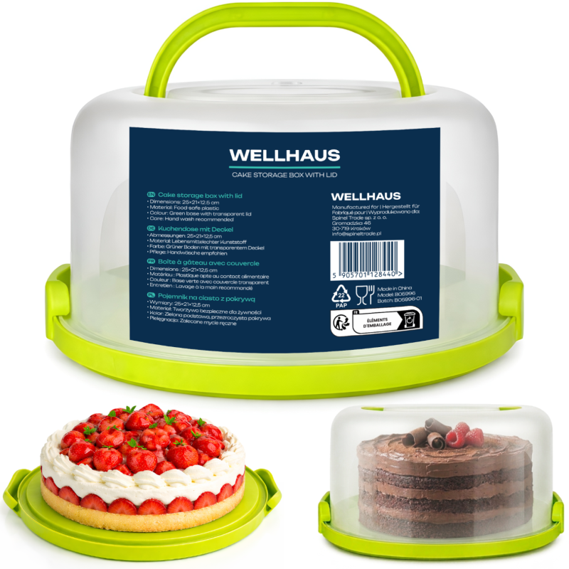 Pojemnik WELLHAUS skutecznie chroni wypieki przed wysychaniem oraz uszkodzeniem podczas transportu. Stabilna podstawa zapewnia odpowiednie podparcie dla ciasta, dzięki czemu możesz bezpiecznie przenosić je w różne miejsca.