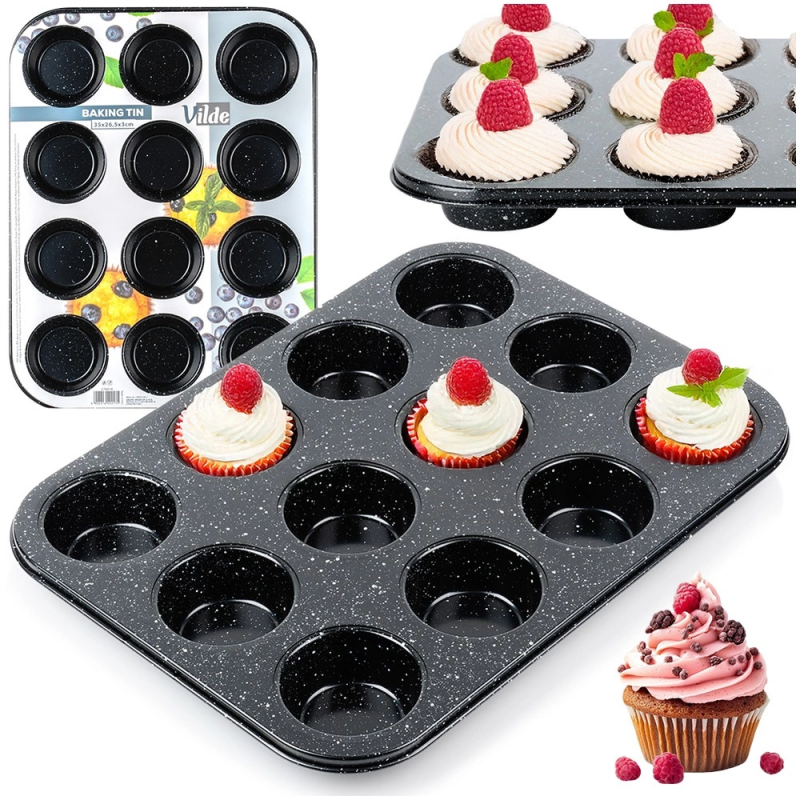 Granitowa forma do muffinek marki Vilde to niezbędnik każdego miłośnika domowych wypieków. Dzięki 12 otworom umożliwia jednoczesne przygotowanie tuzina pysznych muffinek – zarówno słodkich, jak i wytrawnych. Wykonana z wysokiej jakości stali węglowej i pokryta powłoką granitową, gwarantuje trwałość, wygodę i niezawodne rezultaty pieczenia. Doskonale sprawdzi się zarówno podczas codziennego pieczenia, jak i przy przygotowywaniu wypieków na specjalne okazje.