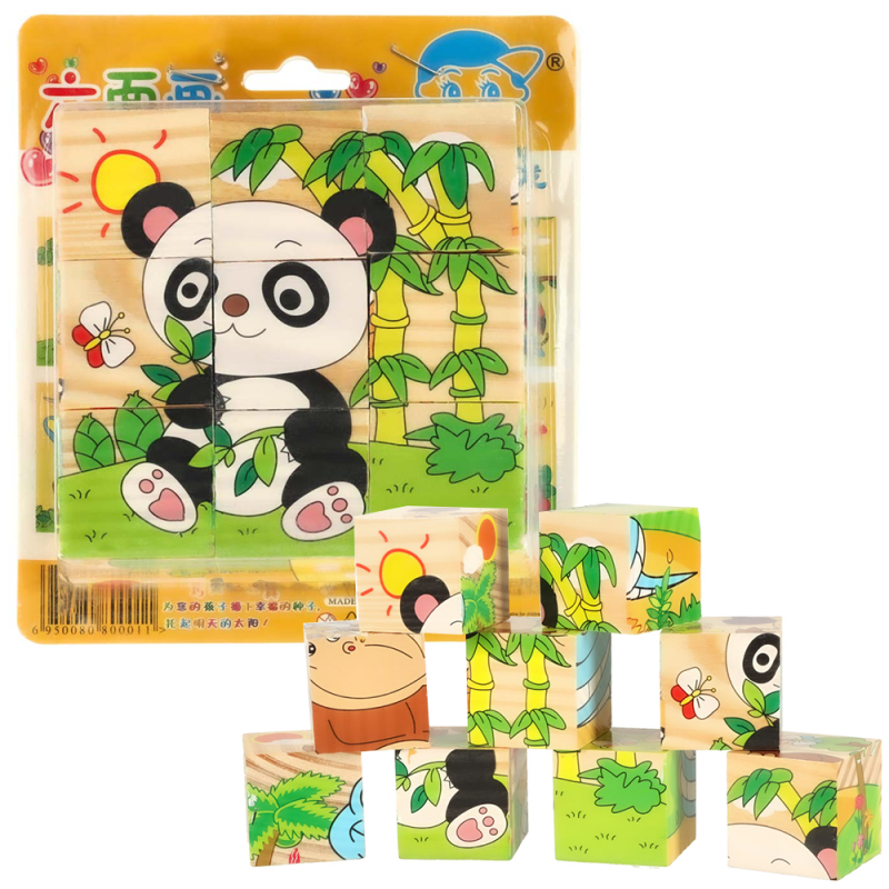 Wspaniała układanka dla dzieci zawierająca 6 różnych wzorów do ułożenia. Na obrazkach znajdują się takie zwierzęta jak: panda, wąż, małpka, struś, kangur, wielbłąd. Zestaw składa się z 9 drewnianych elementów, klocki są w pełni bezpieczne, precyzyjnie wyszlifowane niezawierające ostrych krawędzi. Wymiary jednej kości to 3,5 x 3,5 x 3,5 cm, całość układanki 10 x 10 x 3,5 cm.