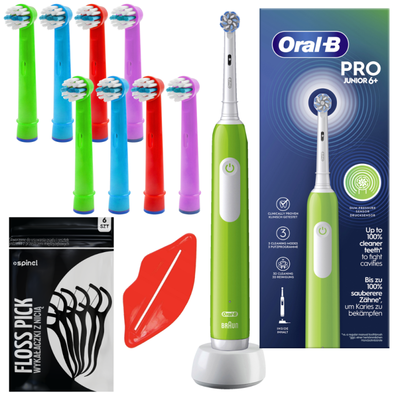 Elektryczna szczoteczka do zębów Oral-B Pro Junior dla dzieci od 6. roku życia zapewnia delikatne i skuteczne usuwanie płytki nazębnej dzięki miękkiemu włosiu główki szczoteczki Sensitive Clean.