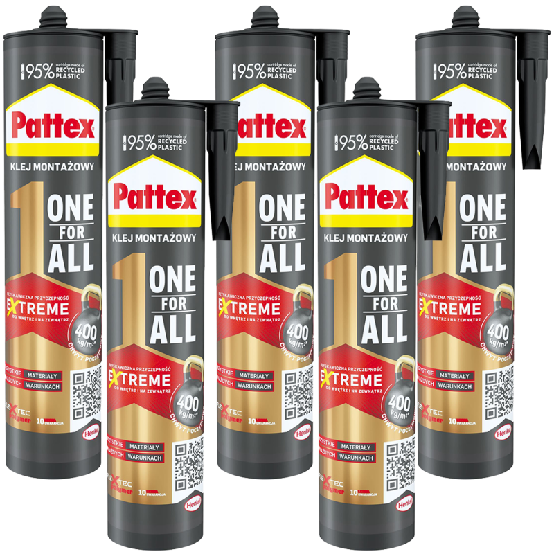jest wysokiej jakości uniwersalnym klejem polimerowym, opartym na technologii "Flextec polymer". Dzięki zastosowaniu formuły BŁYSKAWICZNA PRZYCZEPNOŚĆ do 400 kg/m² (40 g/cm² potwierdzone w testach laboratoryjnych firmy Henkel) zapewnia skuteczny przedmiotów bez konieczności długotrwałego podpierania i dzięki temu jest on jednym z najlepszych klejów montażowych błyskawicznych dostępnych na rynku. Przeznaczony jest do wszelkiego rodzaju materiałów i powierzchni, w każdych warunkach. Pattex ONE FOR ALL Błyskawiczna przyczepność klei elementy wewnątrz i na zewnątrz pomieszczeń, wykonane z materiałów chłonnych i niechłonnych.
