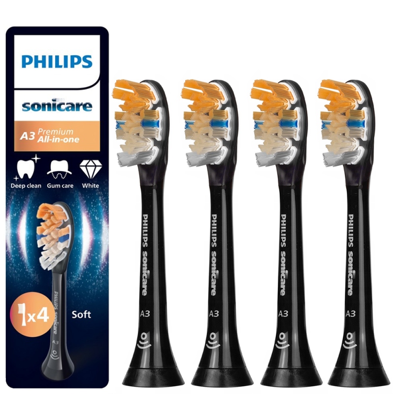 W opakowaniu znajdują się 4 oryginalne końcówki Philips Sonicare A3 Premium All-in-One w kolorze czarnym, zapakowane higienicznie. Zalecana wymiana co 3 miesiące.