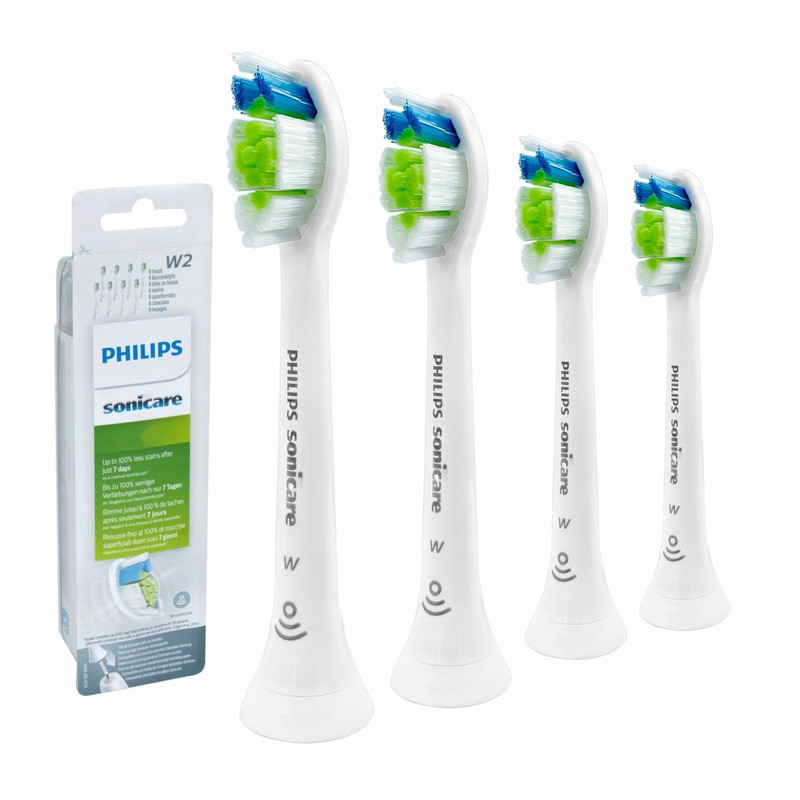 Zestaw zawiera 4 wymienne główki, kompatybilne ze wszystkimi szczoteczkami Philips Sonicare z mocowaniem typu „click-on”.