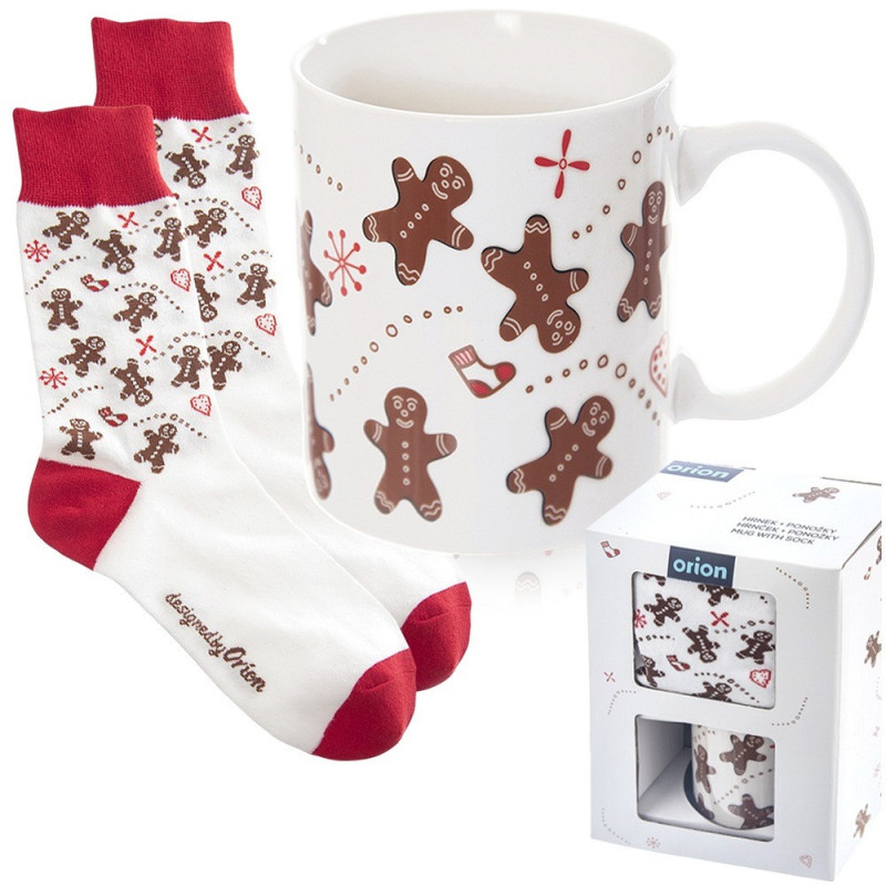 Zestaw świąteczny składający się z kubka o pojemności 350 ml oraz miękkich skarpet w rozmiarze 38–40. Idealny jako prezent, dodatek do zimowych wieczorów lub codzienny, radosny akcent w czasie chłodniejszych dni. Kubek wykonano z trwałej ceramiki i ozdobiono uroczym motywem piernikowych ludzików, a skarpetki zachwycają miękkością i świątecznym wzorem w białoczerwonej kolorystyce.