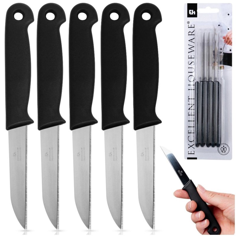 Zestaw 5 noży do obierania Excellent Houseware to idealne narzędzie do każdej kuchni – zarówno domowej, jak i profesjonalnej. Każdy nóż ma 16 cm długości, z ostrzem o długości 7 cm, co zapewnia precyzyjne i wygodne obieranie owoców, warzyw, a także sprawne krojenie mięsa i innych produktów spożywczych. Dzięki poręcznej konstrukcji oraz zastosowaniu trwałych materiałów, noże są niezawodne, praktyczne i gotowe do intensywnego użytkowania.