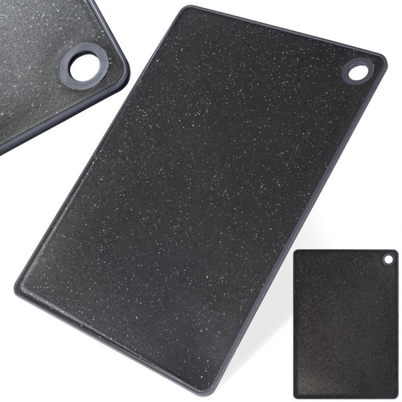 Nowoczesna powierzchnia imitująca granit prezentuje się bardzo elegancko. Deska jest wygodna w czyszczeniu, można ją myć w zmywarce, a praktyczny otwór pozwala na łatwe zawieszenie i przechowywanie.