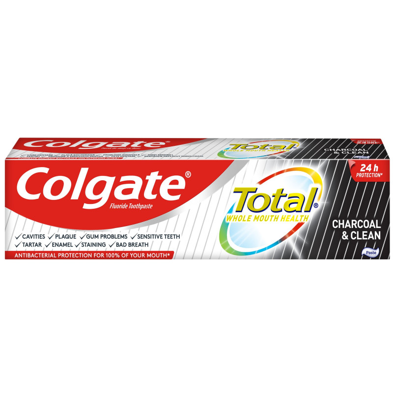 Nowa pasta do zębów Colgate Total Charcoal & Clean dokładnie czyści przestrzenie międzyzębowe i skutecznie zwalcza bakterie w 100% jamy ustnej. Dociera do trudno dostępnych miejsc, zapewniając 24-godzinną ochronę