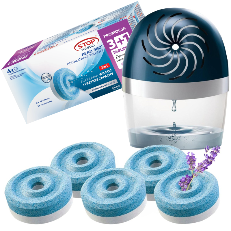 Bezzapachowe tabletki wymienne pasujące do pochłaniaczy wilgoci Ceresit Stop Wilgoci Aero 360 są bardzo wydajne, wystarczy jedna, aby nie musieć przejmować się efektami zawilgocenia na aż 3 miesiące. Opakowanie zawiera 4 tabletki 450g bezzapachowe oraz 1 tabletkę 450g o zapachu lawendowym.