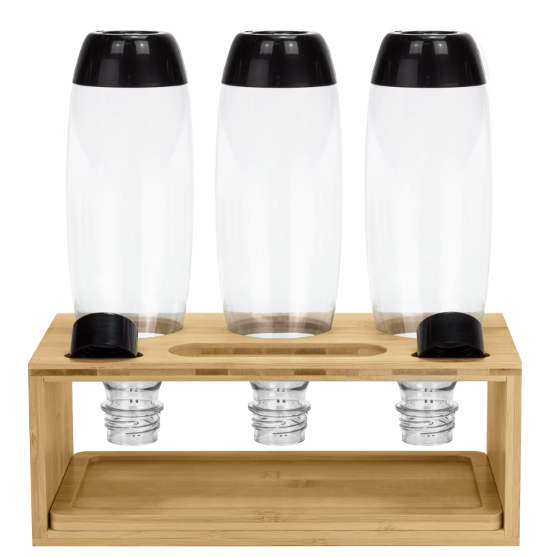 Uchwyt mieści trzy butelki oraz nakrętki, co czyni go idealnym akcesorium dla każdego użytkownika saturatora.