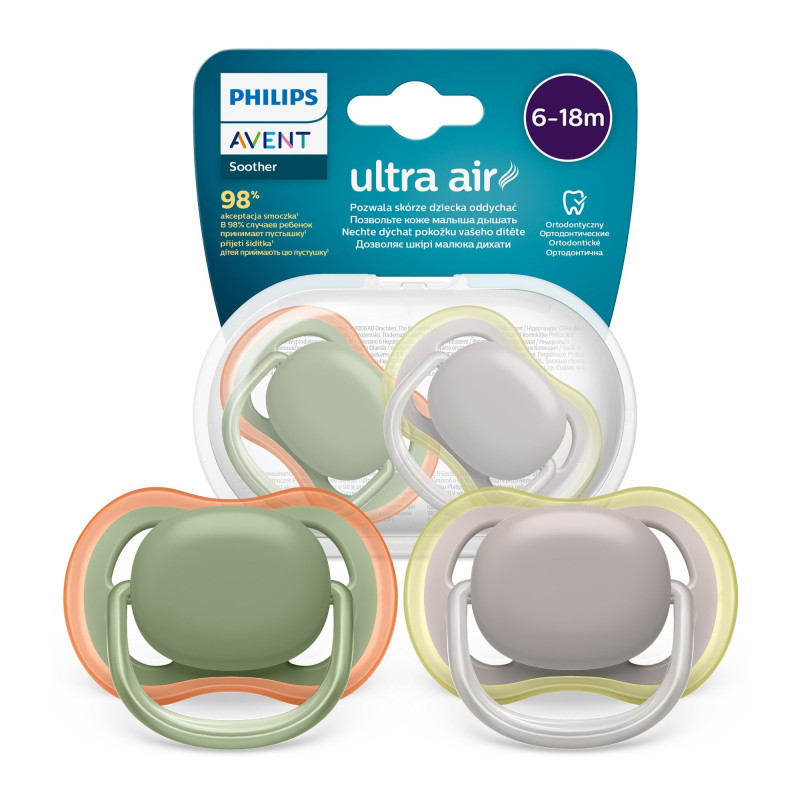 Opakowanie zawiera 2 smoczki Ultra Air w wersji wielokolorowej (6–18 m) oraz etui. Taki zestaw pozwala na rotację smoczków lub trzymanie jednego egzemplarza w zapasie. Dołączona instrukcja oraz karta gwarancyjna uzupełniają komplet, tworząc praktyczny zestaw dla rosnącego malucha.