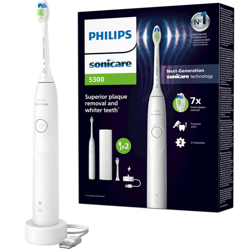 Philips Sonicare 5300 Series HX7108/02 to nowoczesna szczoteczka soniczna, która usuwa nawet do 7 razy więcej płytki nazębnej niż klasyczna szczoteczka manualna, a przy tym pomaga rozjaśnić uśmiech dzięki wybielającym końcówkom W2 Optimal White. Zaawansowana technologia soniczna nowej generacji, czujnik nacisku, dwa poziomy intensywności oraz wbudowane timery wspierają prawidłową technikę szczotkowania i delikatną pielęgnację dziąseł. Wydajna bateria do 3 tygodni pracy, etui podróżne i ładowarka USB sprawiają, że to idealny wybór zarówno na co dzień, jak i w podróży.
