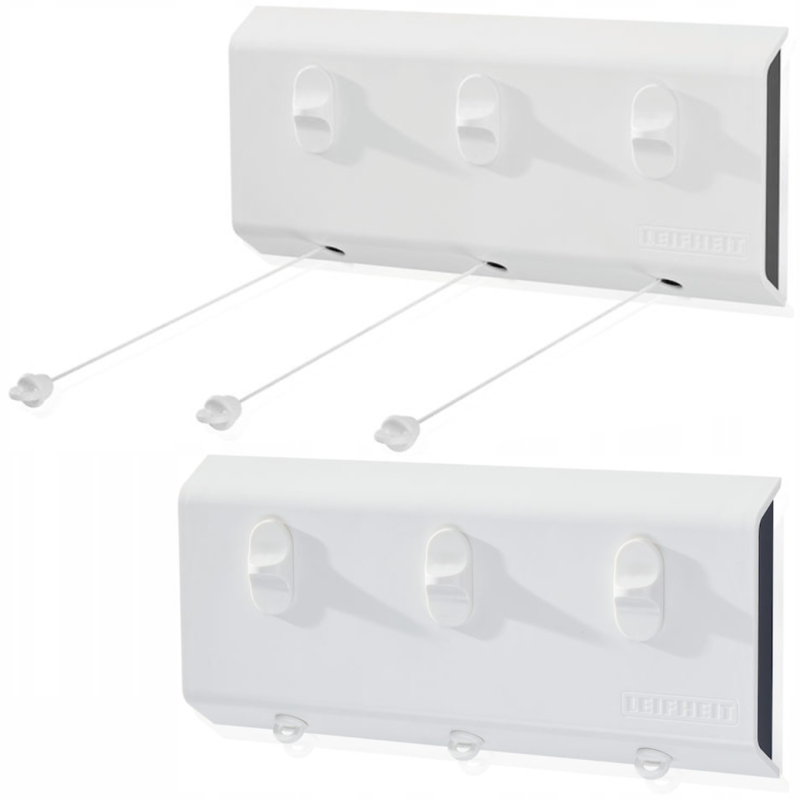 Elastyczna, łatwa w obsłudze i zajmująca mało miejsca suszarka ścienna Rollfix sprawia, że rozwieszanie prania jest jeszcze szybsze i wygodniejsze. Model ten został wykonany z wytrzymałego tworzywa sztucznego odpornego na warunki atmosferyczne, więc można używać go zarówno wewnątrz domu, jak i na balkonie czy w ogrodzie. Suszarkę mocuje się na ścianie, a po przeciwnej stronie umieszcza się haki, na których będzie można zaczepić trzy indywidualnie rozciągane linki. Elementy, które są niezbędne do zamontowania suszarki, znajdują się w zestawie.