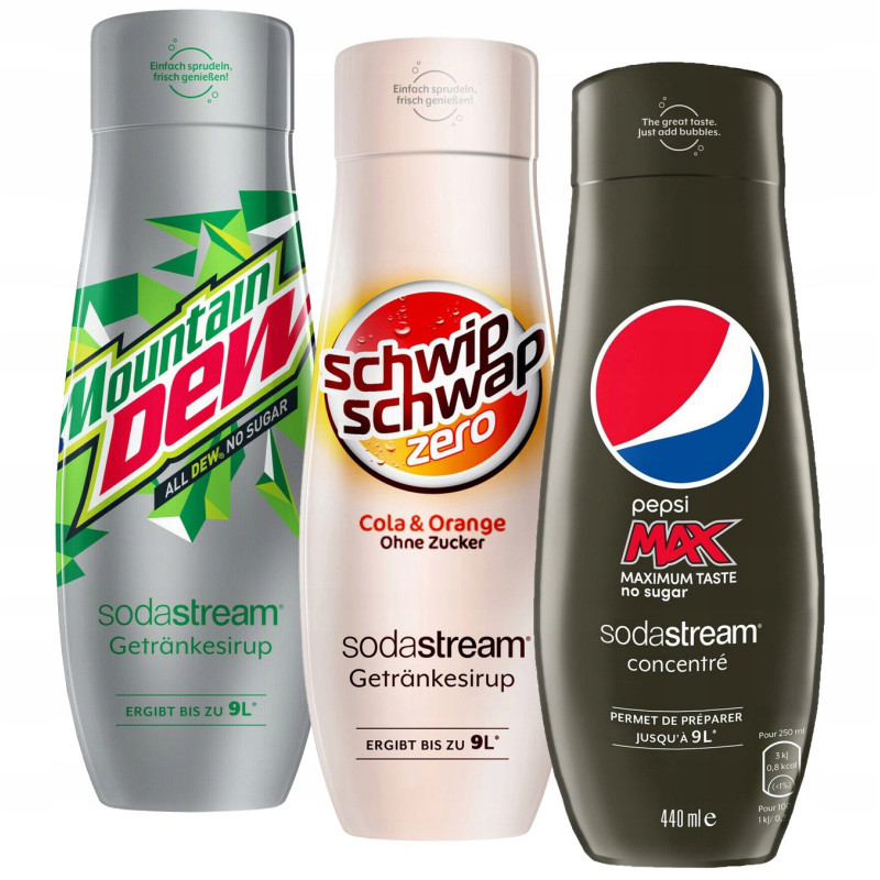 koncentrat do saturatora Soda stream pozwoli Ci na zrobienie od 9l napoju. Syrop może być również stosowany do rozpuszczania w wodzie, co zagwarantuje niepodrabiany smak MOUNTAIN DEW, PEPSI, SCHWIP SCHWAP bez cukru.