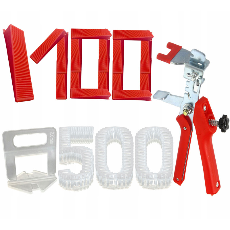 Klips do poziomowania płytek 1.0 mm (zestaw po 100 sztuk) x5 + 100 klin 25 narożników + Obcęgi
