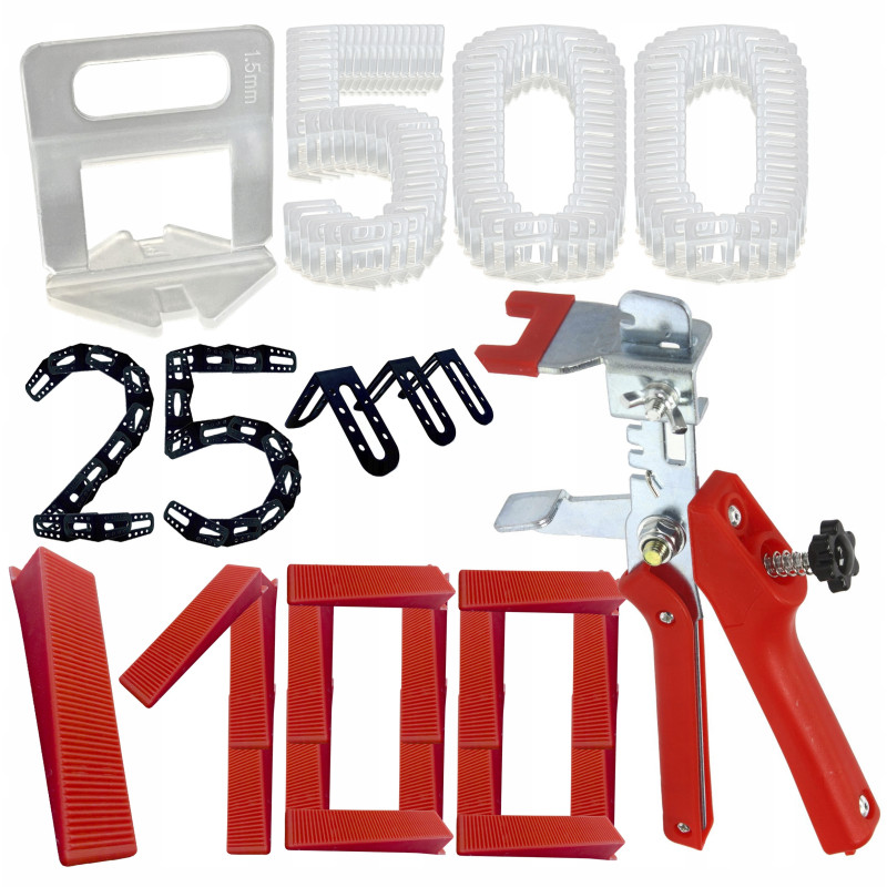 Klips do poziomowania płytek 1.0 mm (zestaw po 100 sztuk) x5 + 100 klin 25 narożników + Obcęgi