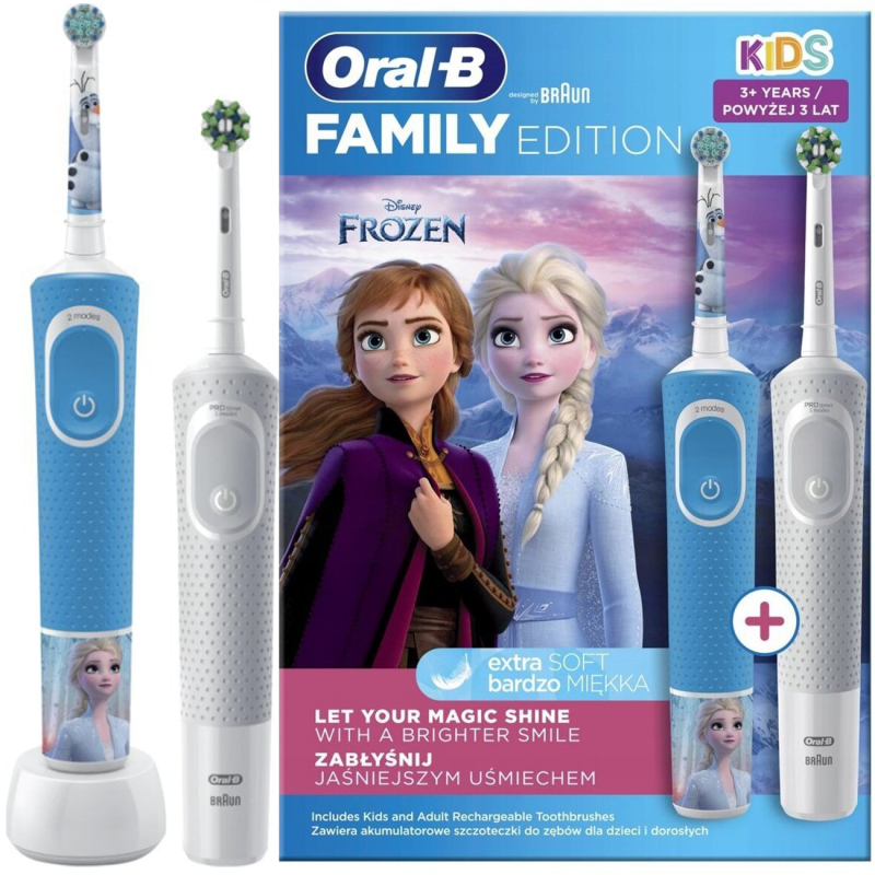 W zestawie Oral-B Family Edition znajdują się dwie elektryczne szczoteczki do zębów. Jedna z nich to Oral-B Kids dla dzieci powyżej 3 roku życia, z motywem z Krainy Lodu i naklejkami do personalizacji. Druga to Oral-B Vitality Pro dla dorosłych. Ten zestaw rodzinny jest doskonały do codziennego użytku. Szczoteczki elektryczne zapewniają skuteczniejsze i łagodniejsze czyszczenie. Dzięki systemowi 2D, który wykorzystuje ruchy oscylacyjno-rotacyjne, pomogą usunąć aż do 100% więcej płytki bakteryjnej niż szczoteczka manualna. Dodatkowo szczoteczka dla dzieci posiada atrakcyjny motyw z Krainy Lodu i naklejki do personalizacji, co zachęci najmłodszych do dbania o zdrowie jamy ustnej.