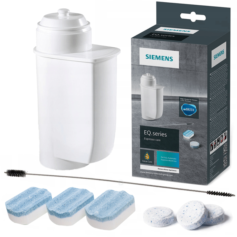 Kompletny zestaw firmy Siemens obejmuje kluczowe akcesoria do utrzymania w czystości i konserwacji ekspresu do kawy. W skład zestawu wchodzą filtr wody Brita Intenza, tabletki do czyszczenia, tabletki do usuwania kamienia oraz szczotka do czyszczenia przewodu mleka. Zestaw jest przeznaczony do wykorzystania w pełni automatycznych ekspresach do kawy marki Siemens i Bosch.