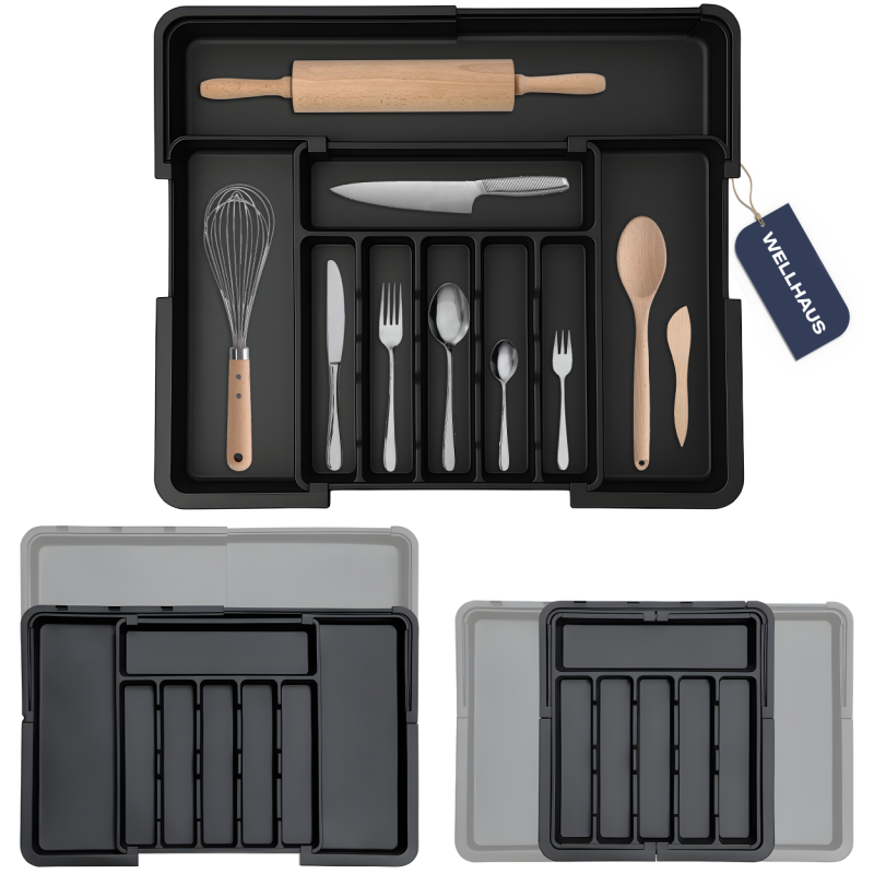Zadbaj o idealny porządek w swojej kuchni z organizerem WELLHAUS Expandable Drawer Organizer – stylowym i funkcjonalnym rozwiązaniem, które dopasujesz do każdej szuflady. Dzięki inteligentnemu systemowi rozsuwania w dwóch kierunkach oraz wbudowanym modułom na noże, organizer WELLHAUS gwarantuje maksymalną wygodę, bezpieczeństwo i estetykę przechowywania sztućców akcesoriów kuchennych oraz innych przedmiotów, np. narzędzi czy artykułów biurowych.