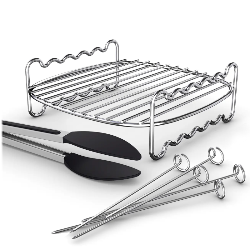Ten zestaw akcesoriów marki Philips to dwuwarstwowy ruszt + szczypce + szpikulce, zaprojektowany specjalnie, aby maksymalnie wykorzystać przestrzeń w Airfryer o pojemności 6,2 l, 8,3 l lub 9 l.
