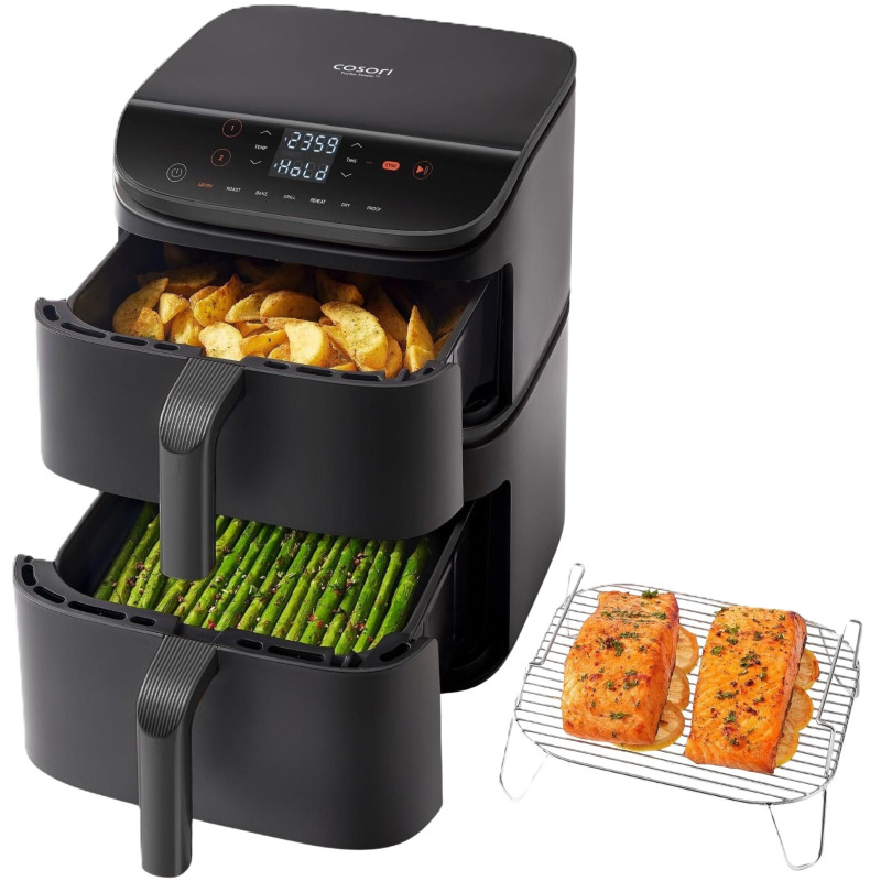 Dwa kosze o różnej pojemności pozwalają przygotować różne elementy posiłku jednocześnie. Możesz piec mięso i warzywa w tym samym czasie lub przygotować dwie różne potrawy bez mieszania smaków i zapachów.